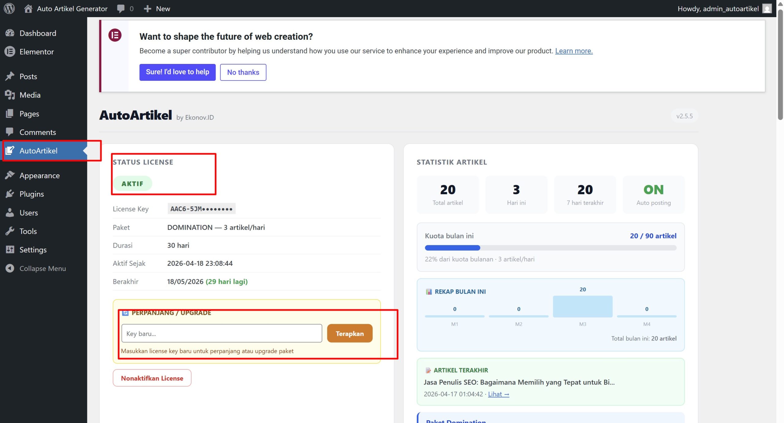 Setelah license aktif, scroll ke bawah atau buka tab