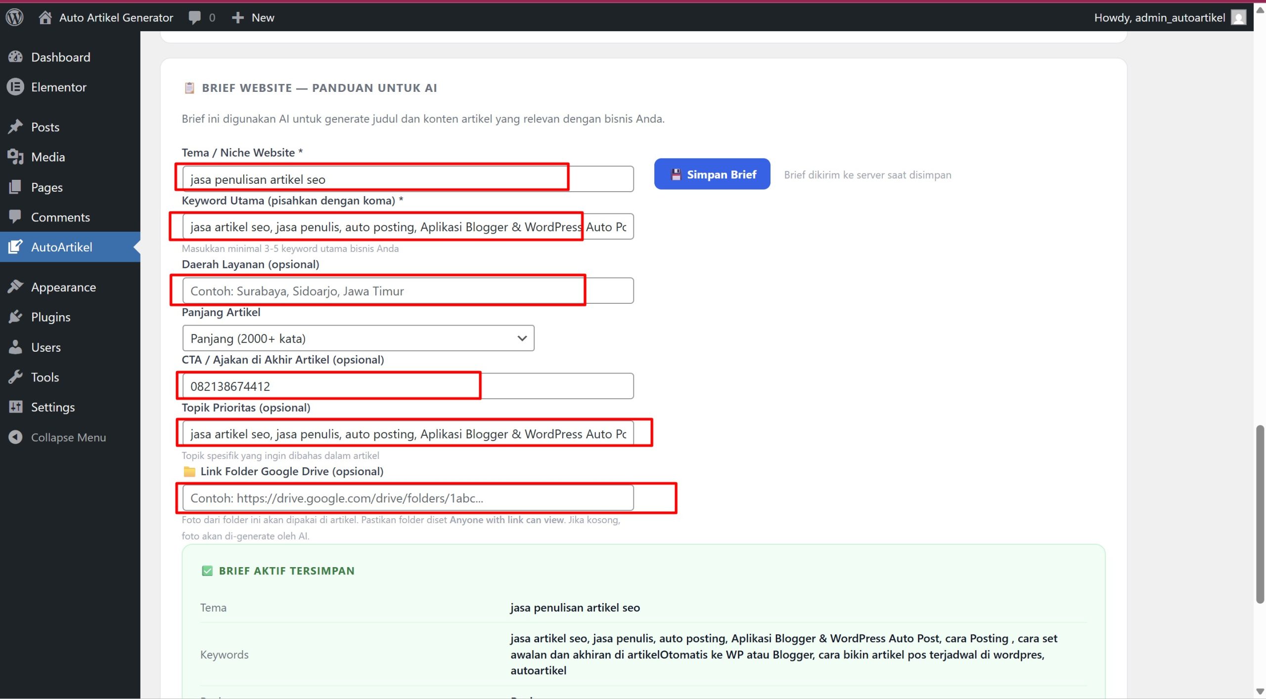 Isi semua field sesuai bisnis kamu — ini yang dipakai AI untuk generate artikel.Isi Brief Website — panduan untuk AI generate artikel yang relevan dengan bisnismu